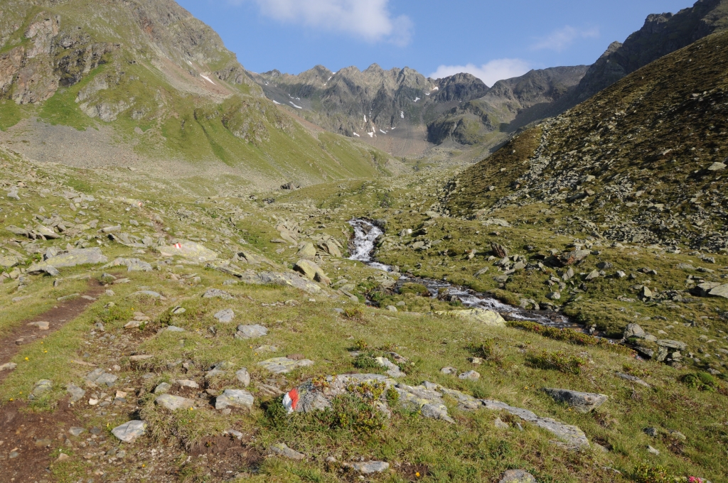 Aufstieg zum Gleierschjöchl. Blick nach Norden zum Roßkogel. Ich habe Respekt vor den 3081 Metern und gehe schweren Herzens weiter Richtung Gleirschjöchl.