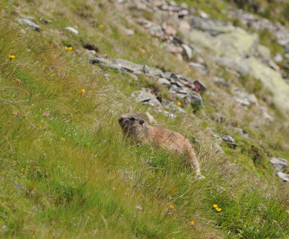 Paß auf, er beißt Dich gleich ins Bein! Murmeltier am Südhang oberhalb des Westfalenhauses.