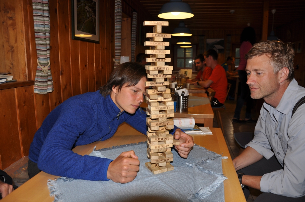 Auf der Hütte: Wir spielen Jenga. Hier Steffi und Christoph.